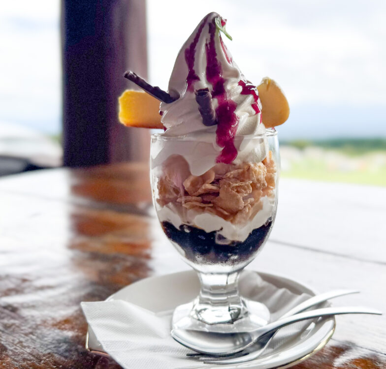 甘さやベリーソースの酸味、サクサクしたコーンフレーク、底にあるコーヒーゼリーのほろ苦さなど食べる場所によって違う味と食感が楽しめるパフェです。