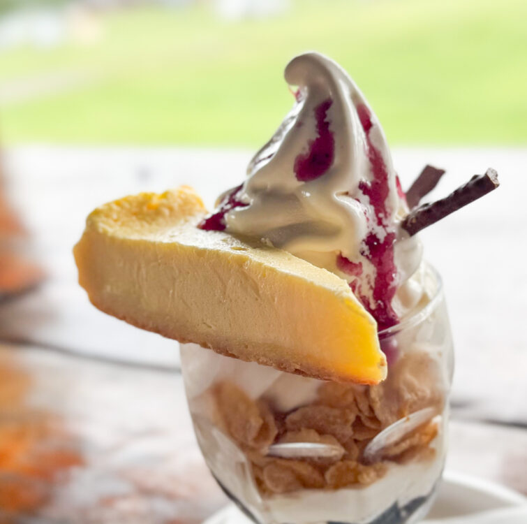 甘すぎず、優しい甘みのチーズケーキがドン! と裏側にのっています。ソフトクリームとチーズケーキを一緒に味わうと、さらにおいしいですよ。