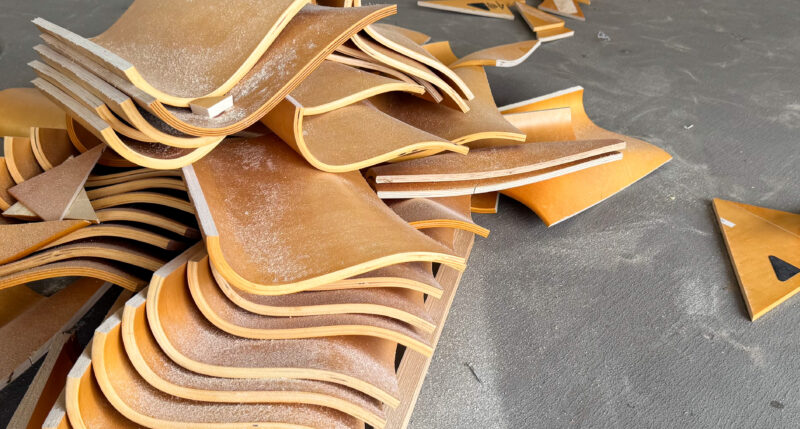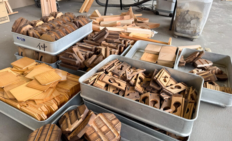 この作品で使用された廃材は、閉館した本館や中館で使用されていた下駄21足、座椅子42台、釜飯の蓋32個、民芸風こんろの木枠60個。サイズに合わせ廃材をカットされている様子も!