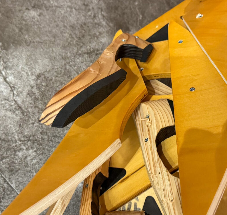 立体的なたてがみ部分は、座椅子や下駄が使用されています。下駄は半分に割り、底のすべり止めの黒い部分が活かされています。