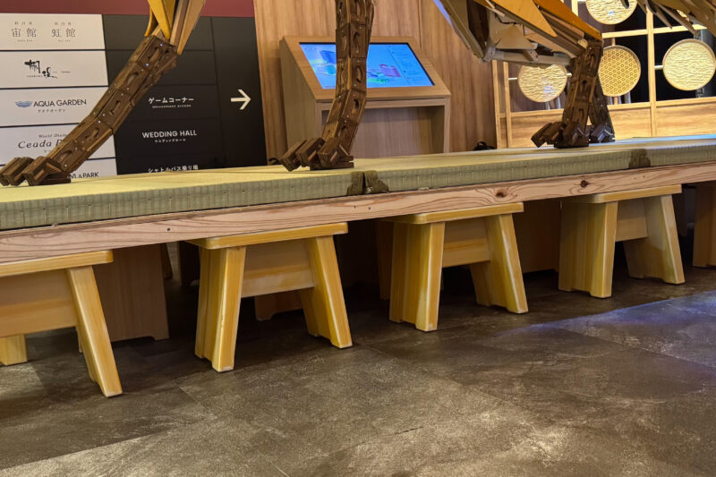 作品を展示する台は、風呂イスが28脚、畳を4畳使用して作られました。