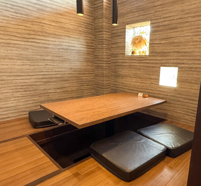 落ち着いたシックな店内は、掘りごたつのお席があります。お祝い事や集まりごとにも利用しやすいですよ。
