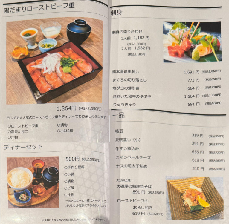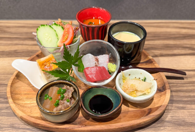 季節の小鉢、洋風小鉢、サラダ、刺身、佐伯米水津のにがりでつくる手作り豆腐、茶碗蒸しの6品です。