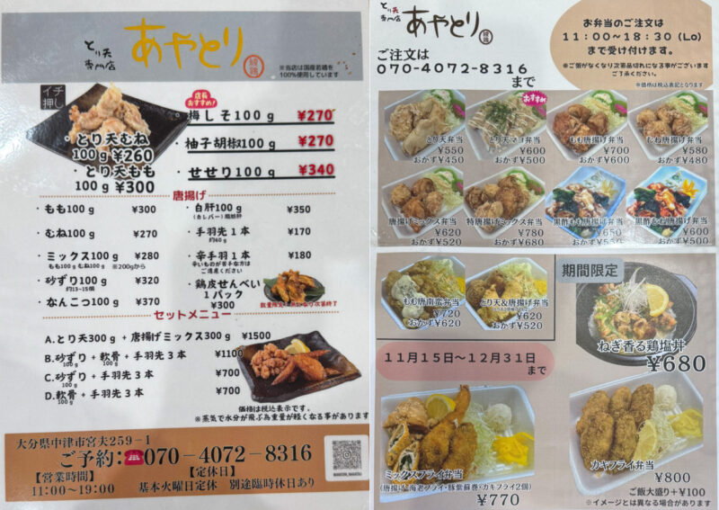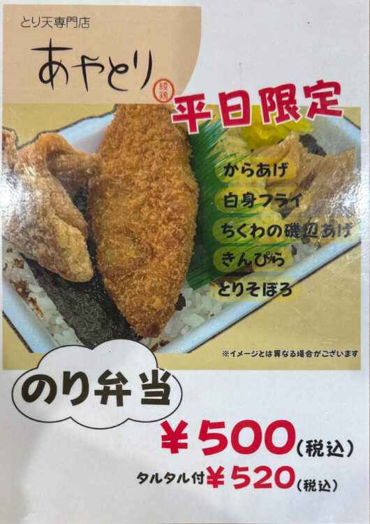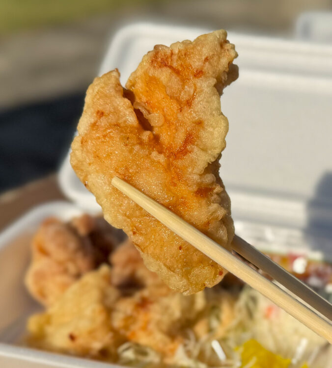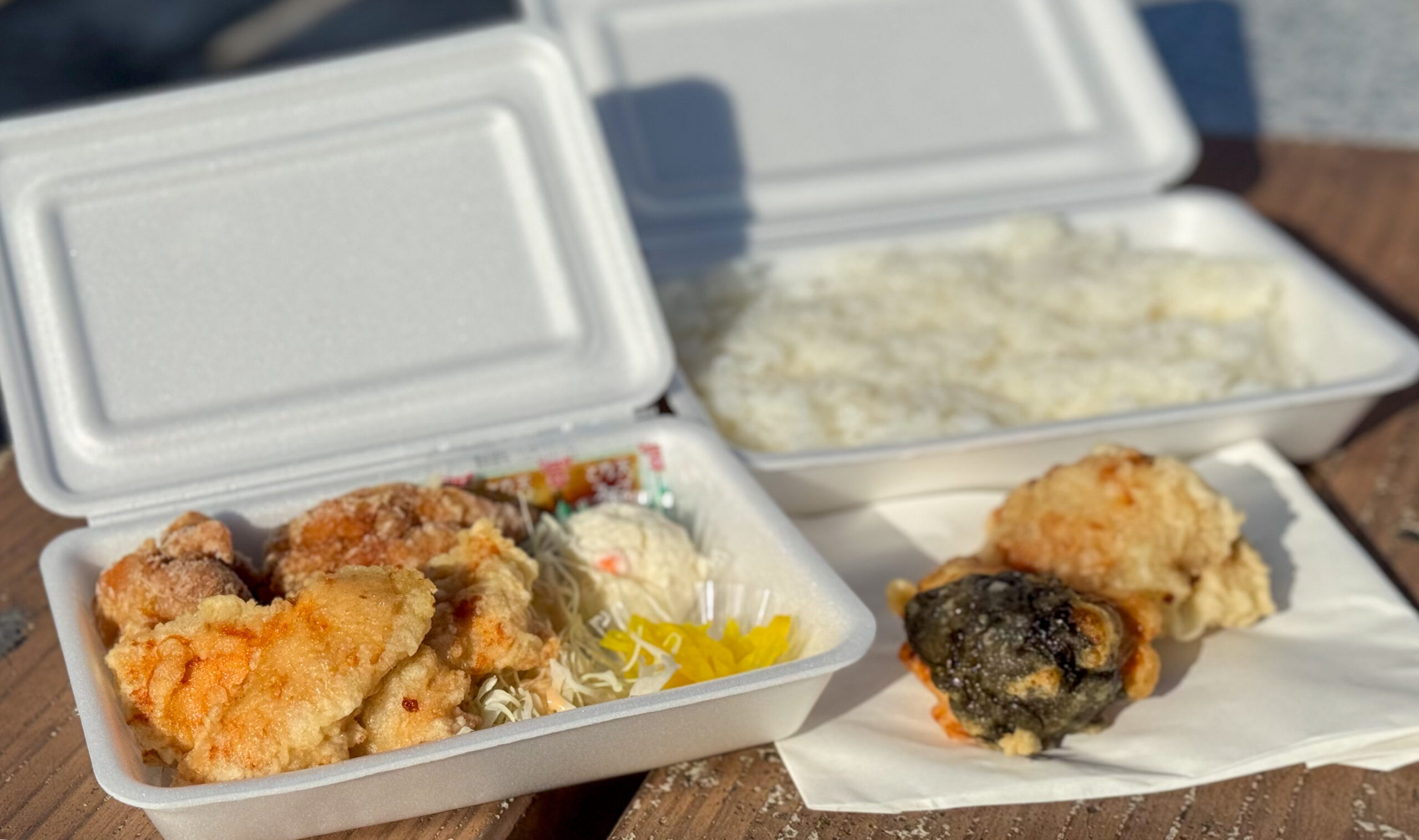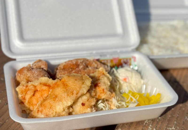 むねのとり天が2個、唐揚げのももが2個入っています。『あやとり』さんが初めての人や両方食べたい人にはピッタリな弁当です!