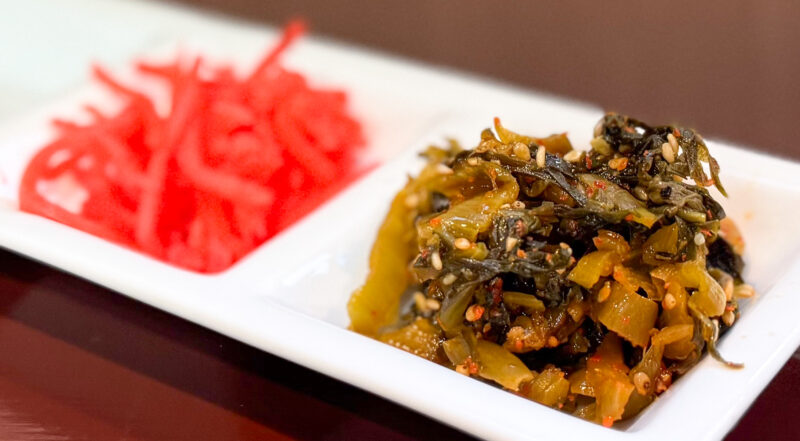 セルフの無料トッピングコーナーがあります。辛子高菜、紅ショウガ、生にんにくのすりおろし、ゴマ、ラーメンこしょうが用意されています。