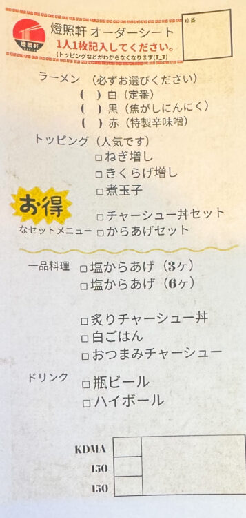 注文する際は、席に用意されているオーダーシートに記入をしてスタッフさんへ渡します。