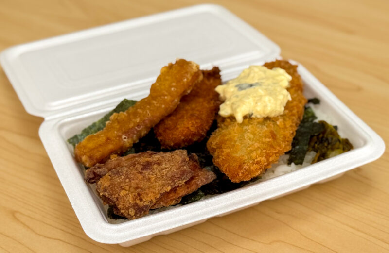 からあげ、ささみカツ、白身フライ、ちくわがのっていてボリューミー! フライが大きいので、蓋が閉まらない弁当です。