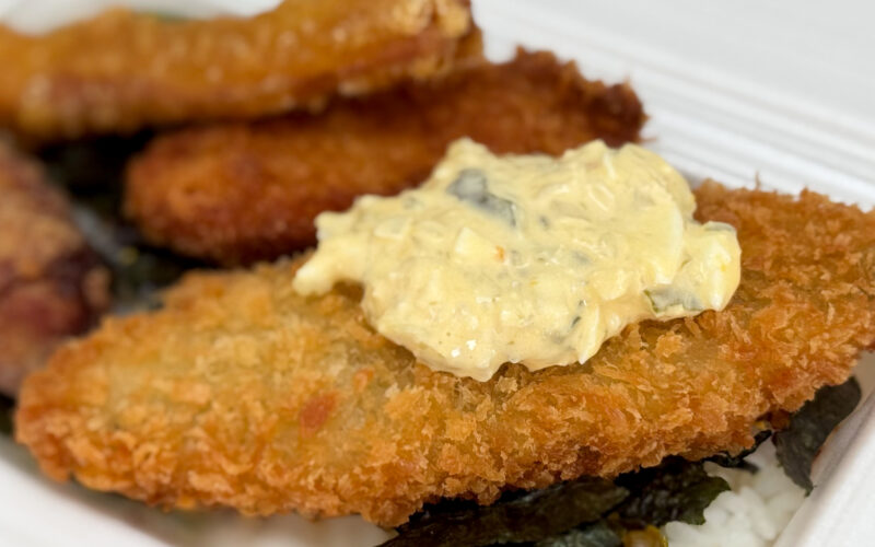 白身フライの上にのっているタルタルソースは、卵が大きめにカットされています。ささみカツにもちくわにもタルタルソースが合う―! ジューシーなからあげもおいしいですよ♪