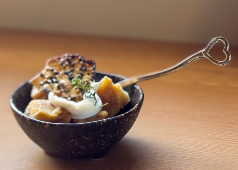 辛いものが苦手な人のために、卵黄をつけてくれます。もし食べはじめて想像以上に辛い! と思った人へも上から乗せてくれるので、お店の方へお伝えください。