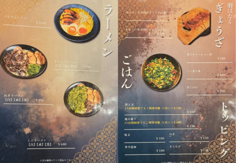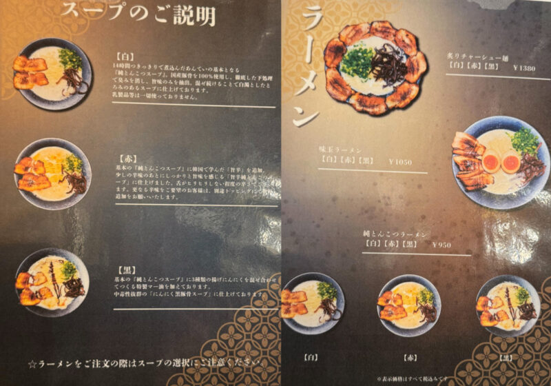 ラーメンは大きく分けて3種類あります。デフォルトの白、白に辛味をのせた赤、白に特性マー油をのせた黒の3種類です。