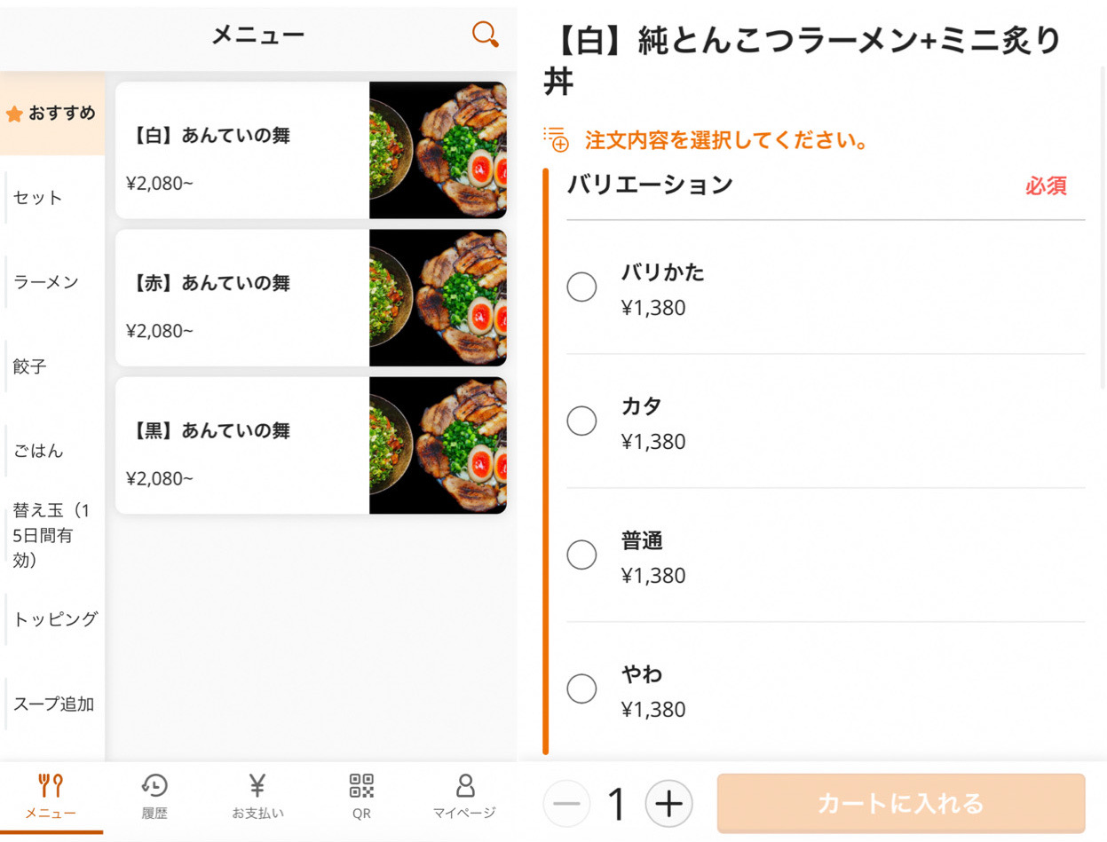 各テーブルに用意されているQRコードをスマホで読み取り注文をおこないます。分かりやすい注文画面です。ラーメンを選んだ後に、麺の硬さを選ぶことができます。