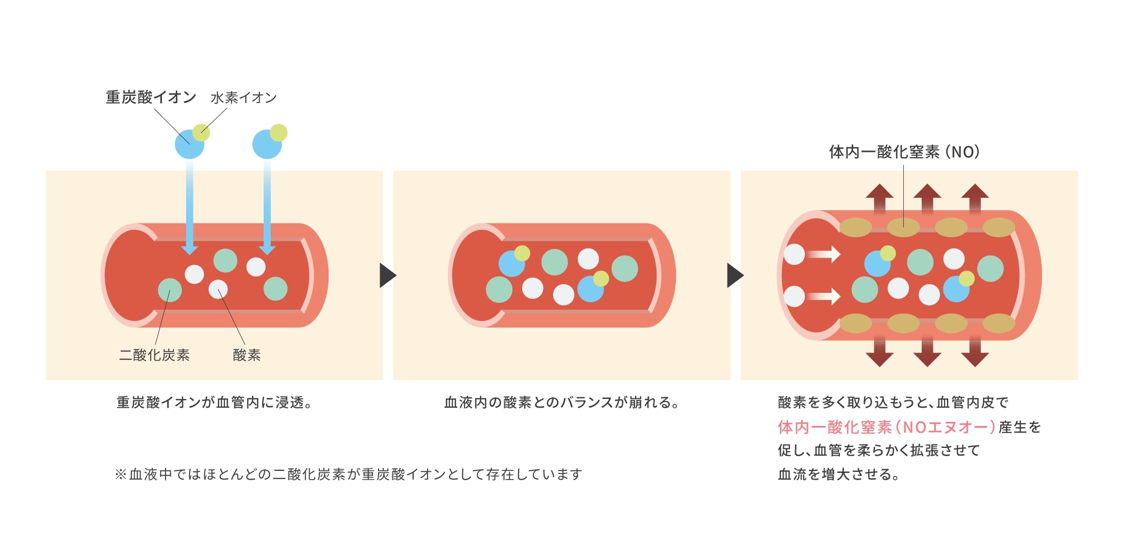 NOとは、血管拡張ホルモン一酸化窒素のことです。重炭酸イオンの効果によって、血管を拡張し一気に血流を上げ、免疫の改善やあらゆる健康効果を発揮する体内健康ホルモンです。