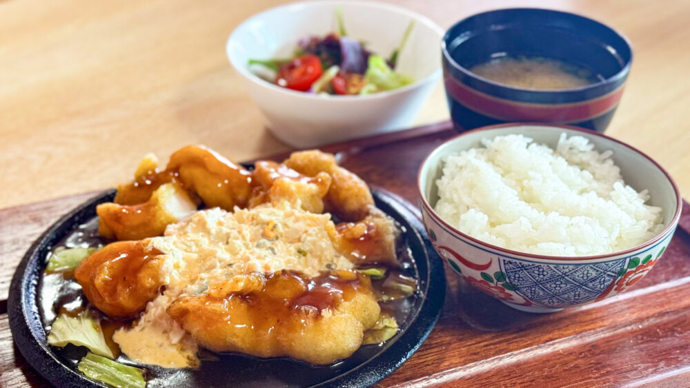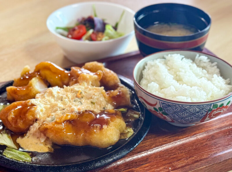 鉄板に盛られたたっぷりのチキン南蛮やサラダ、ご飯、みそ汁が運ばれてきました。チキン南蛮が2倍盛られた『チキン南蛮BIGプレート』は1,300円で注文できます。こちらは、腹ペコさんに嬉しいお得なメニューです。