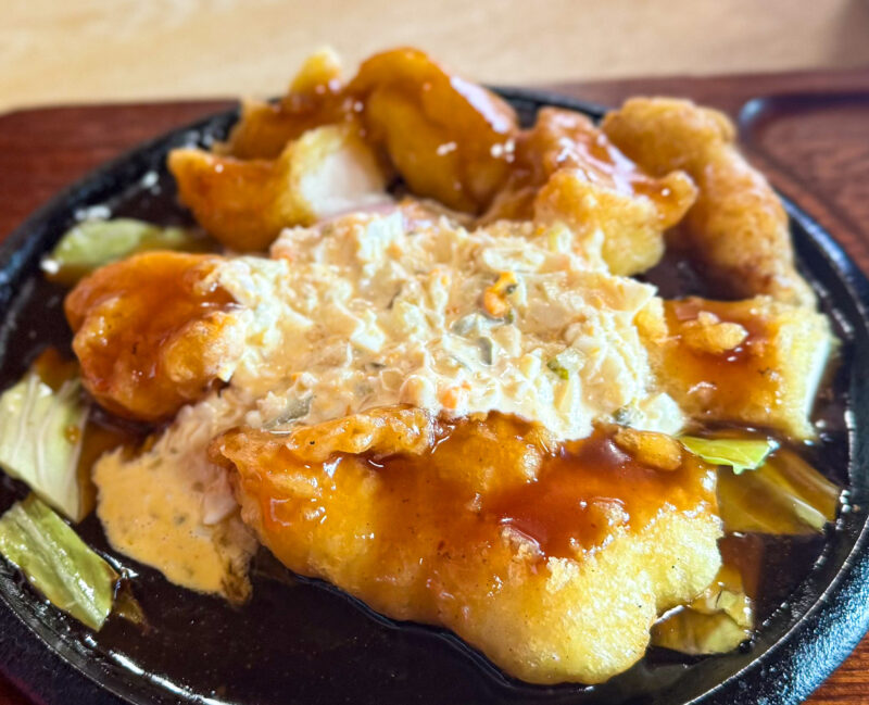 たっぷりのタルタルソースの中には温玉が入っており、見た目以上に濃厚なソース! 甘酢タレもよく絡みます!