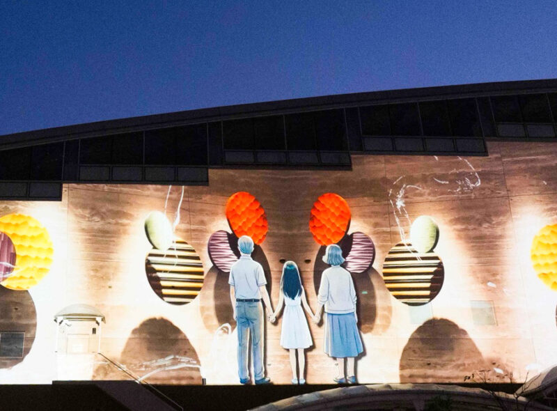 この一環として『大分県立芸術文化短期大学美術科デザイン専攻メディアデザインコース』の学生および講師とともに、全天候型アミューズメントプール『アクアビート』全長約58メートルの屋外壁面をスクリーンにしたプロジェクションマッピングが共同制作されました!