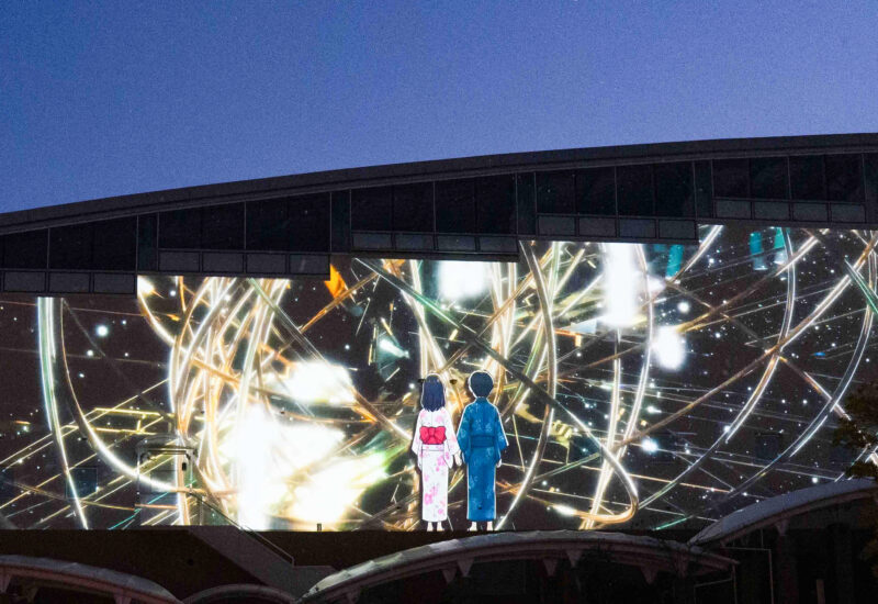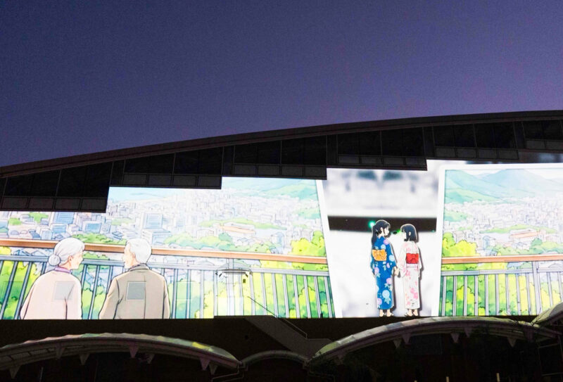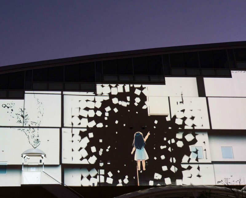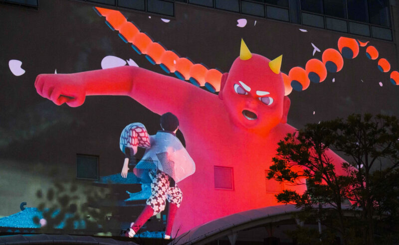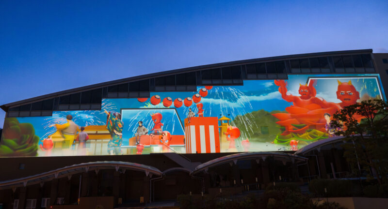 別府の温泉や自然、鬼伝承をテーマに『杉乃井ホテル』と学生が共に練り上げた作品です。オリジナルキャラクター『ゆげまる』の案内により、鬼が守護の存在へと変わっていく物語を、建物の立体感と重なり合わせながら3DCGで描いています。
