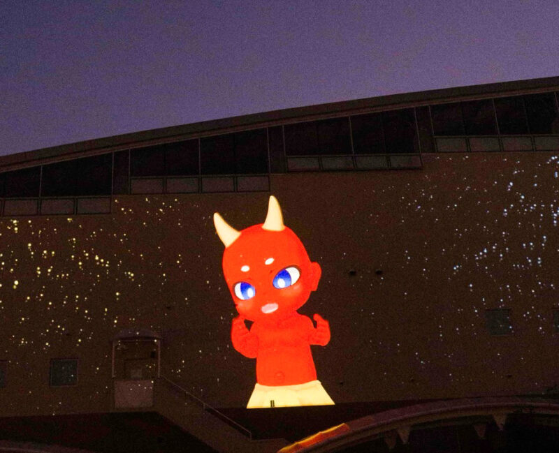 今回のプロジェクションマッピングに関わった学生は、映像表現・CG制作・立体投影の知識を活かし、別府の自然・温泉・鬼伝承をテーマに建物形状に合わせた演出やキャラクター『ゆげまる』を取り入れて、作品を完成させています。