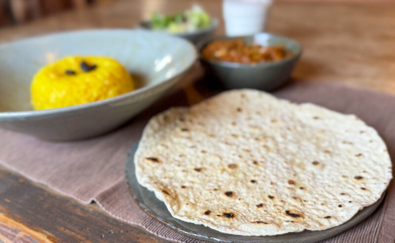 手で食べやすいサイズにちぎりカレーをのせて食べる香ばしいチャパティーは、カレーのおいしさを存分に引き出してくれます。ターメリックライスもついているので、お腹もしっかりと満たされます。