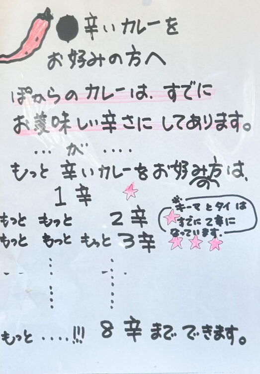 デフォルトで、すでに辛さがあります。特に、キーマとタイカレーは最初から2辛になっているため、辛みを追加する際はお気をつけください。