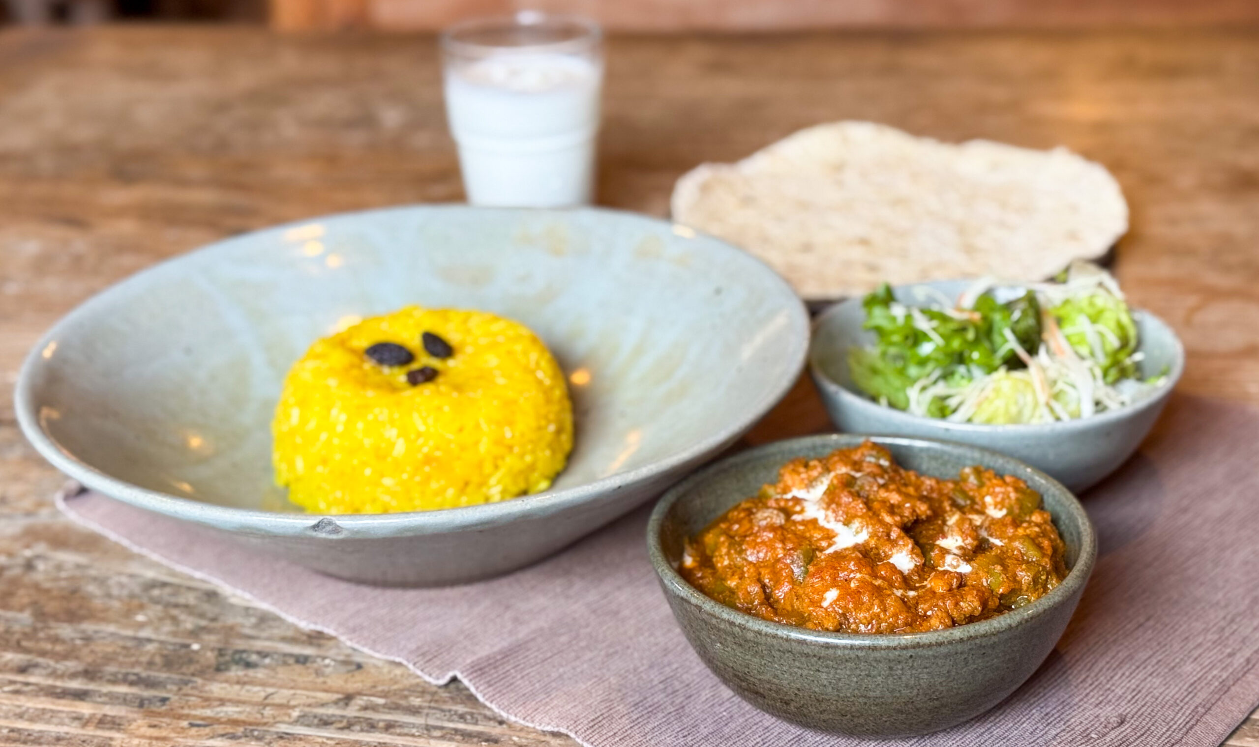 手で食べやすいサイズにちぎりカレーをのせて食べる香ばしいチャパティーは、カレーのおいしさを存分に引き出してくれます。ターメリックライスもついているので、お腹もしっかりと満たされます。