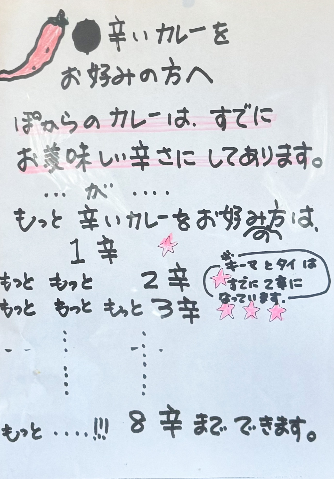デフォルトで、すでに辛さがあります。特に、キーマとタイカレーは最初から2辛になっているため、辛みを追加する際はお気をつけください。