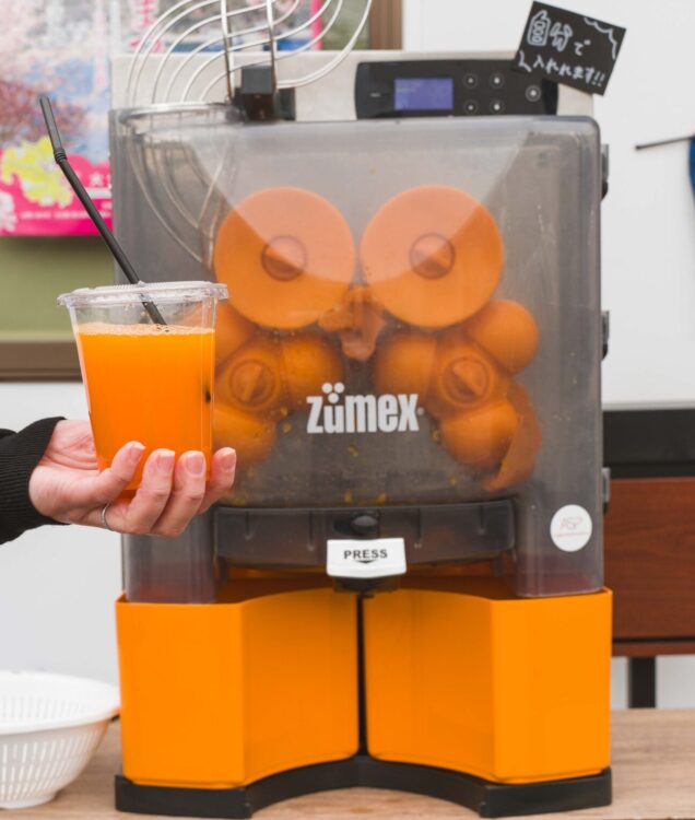 お店の入口にあり、入店する前から気になるマシンを発見! みかん100%の生しぼりみかんジュースができます。