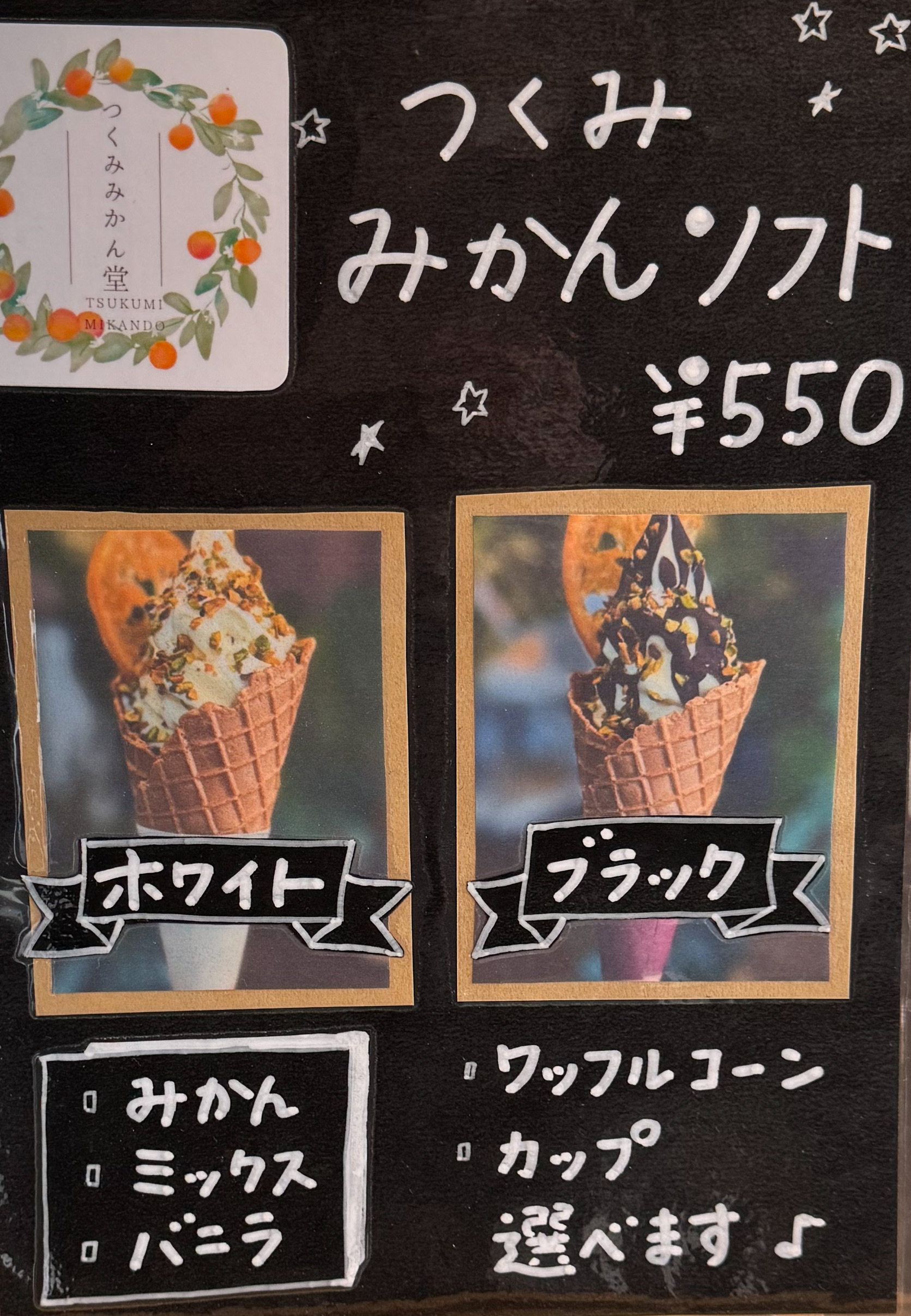 みかんソフトにホワイトチョコをかけてもらいました。実は、コーンの中にもチョコが隠れていますよ。