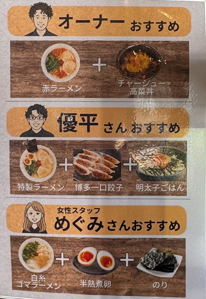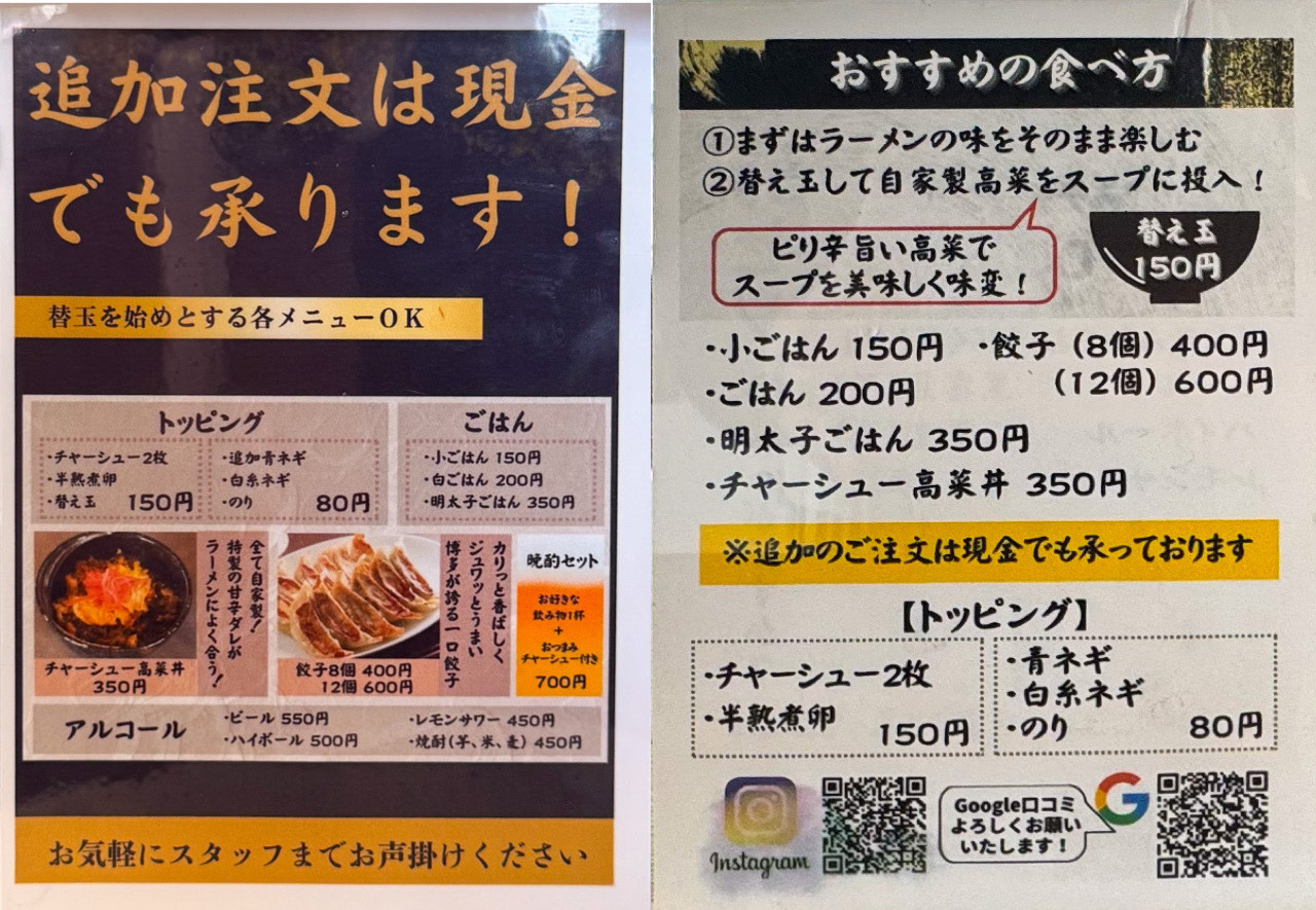 2回目以降の来店でスタンプカードを提示する度、替玉かトッピングが無料、餃子かチャーシュー丼もしくは明太子ご飯が無料、濃厚博多ラーメン一杯無料のいづれかがサービスされます!