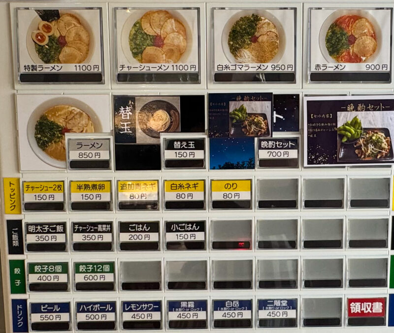 入店してすぐの場所にある券売機にて注文をおこないます。ラーメンだけではなく、ご飯ものや餃子、アルコールもあります。