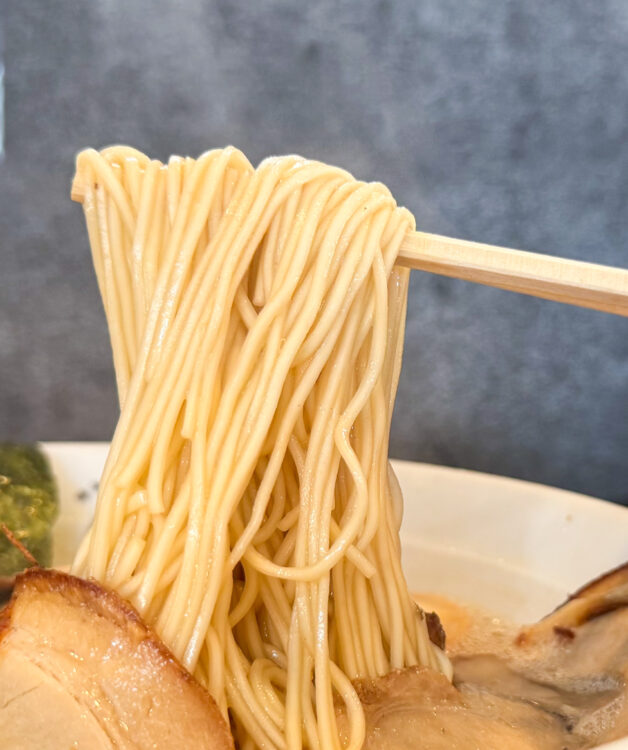 ストレートの細麺です。スープとしっかり絡みます。とても食べやすい一杯なので、お子様もおいしく味わえると思います。