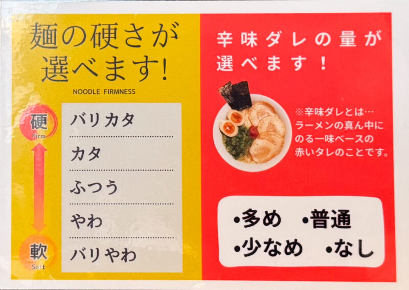 お席に着き食券を渡す際に、麺のかたさと辛味だれの量を選ぶことができます。