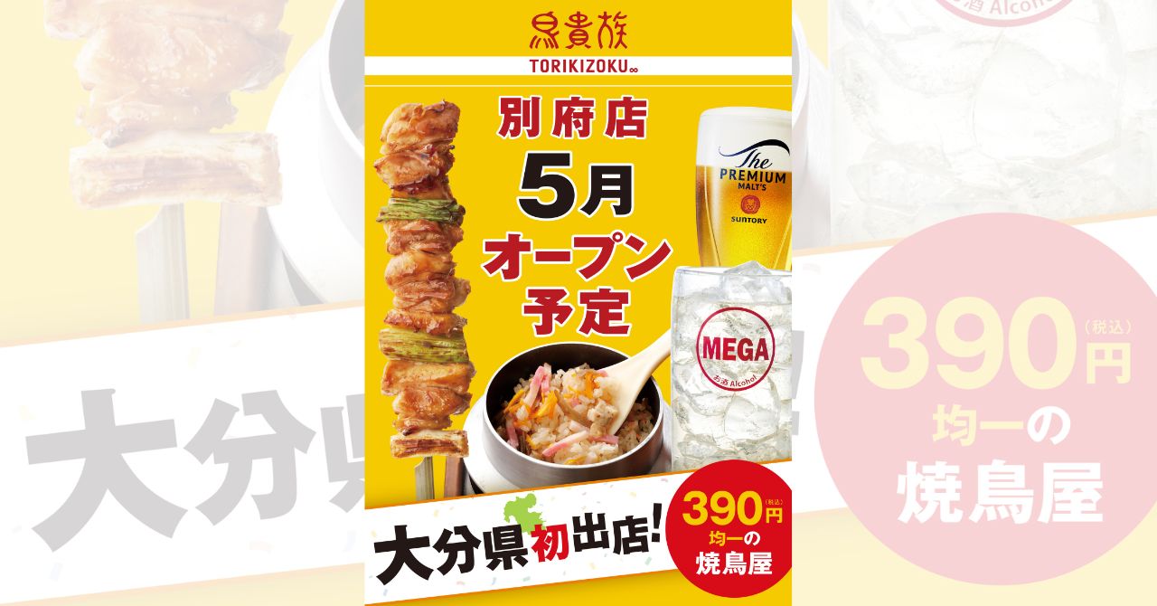 別府への出店により、別府周辺の皆様に鳥貴族ブランドを知っていただくことで、大分県での出店拡大に繋げていきたいと考えられています。
