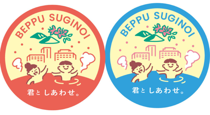 赤と青の2種類は“しあわせ”を想起させる笑顔の人物をメインに、3つの客室棟や別府の扇山、初夏の鶴見岳を彩るミヤマキリシマを取り入れたデザインです。