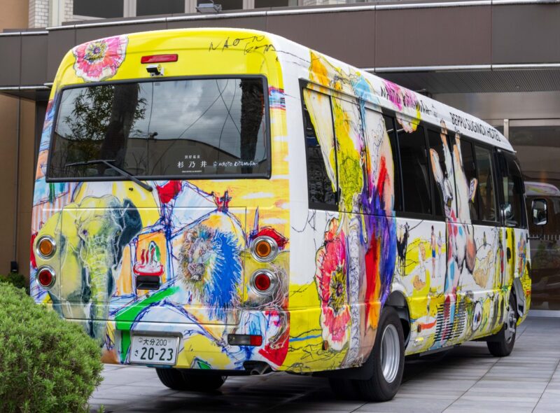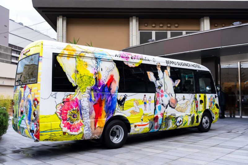 『別府温泉 杉乃井ホテル』さんが、2025年7月にお披露目されたアーティストさんとのコラボラッピングバス。カラフルで可愛い動物のキャラクターを描くJUNPHANT氏や『株式会社naNka』に所属する障がい者アーティスト複数名によってデザインされた無料シャトルバス3台が、現在『杉乃井ホテル』さんの敷地内や別府駅への移動に走っています。