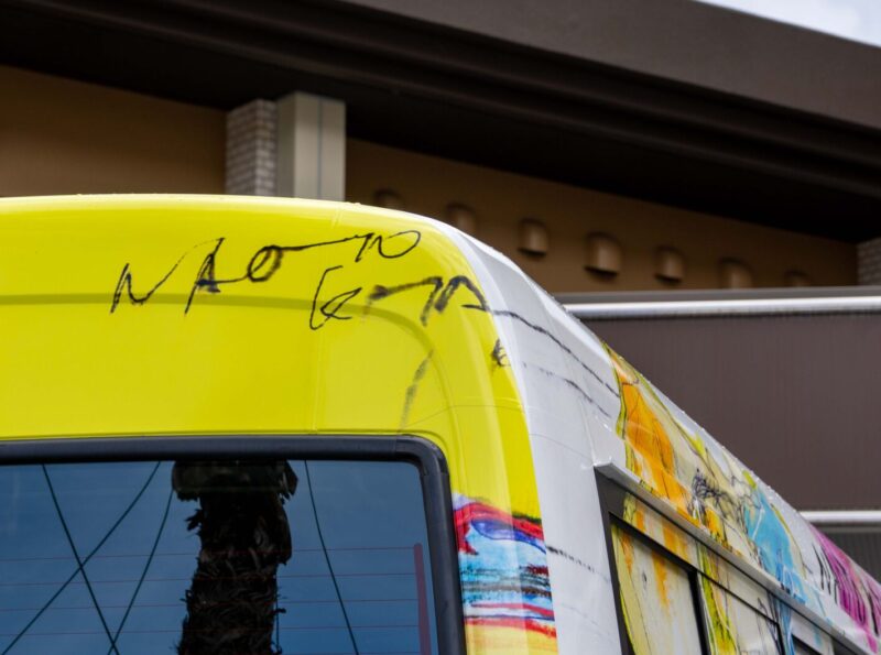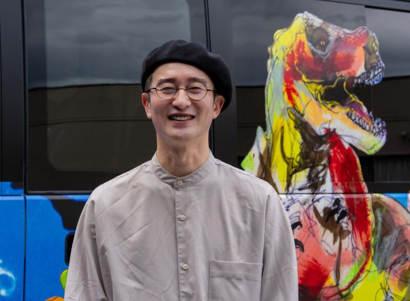 ファンの人ならすぐ気づくと思いますがこのコラボラッピングバスは、北村直登氏の作品では珍しい人物や恐竜が描かれています。人物の作品を見かけることは少ないのでとても貴重であり、本人も作品の説明をした際「人物を取り入れた点を見てほしい」と話をしていたほどでした。