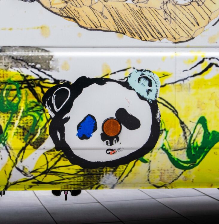 一気に印象が変わる楽しさを狙い、全体を統一させず意図的に面のデザインを変えています。北村直登氏の世界観にどっぷり浸かれるコラボラッピングバスです!