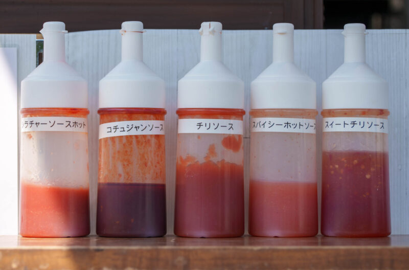 ドッグなどに辛みの刺激を求める人のため、お好みでソースをお借りすることができます。左が一番辛く、右にいくにつれて刺激がおさえられています。