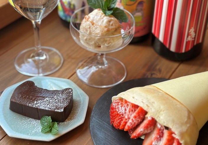 お酒とスイーツを掛け合わせたお店。クレープや地獄蒸しで仕上げたテリーヌ、お酒や甘酒を使ったジェラートなど、別府素材を活かした一品が並びます。世代を問わず、お酒との新しい出会いを楽しめる“新しい日常の入口”となる場所です。
