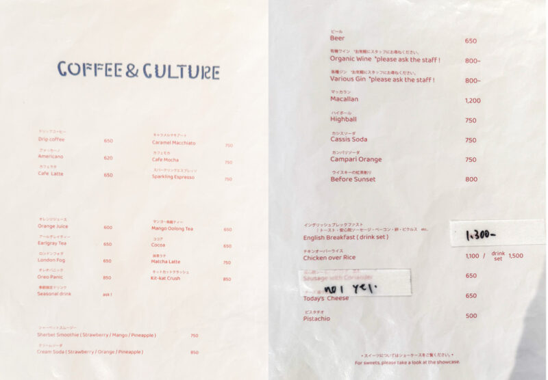 ドリンクは、コーヒーだけではなく紅茶やシャーベットスムージなども販売されています。メニュー表に記載はありませんが、ケーキも販売されています。ケーキの種類はお店でご確認ください。